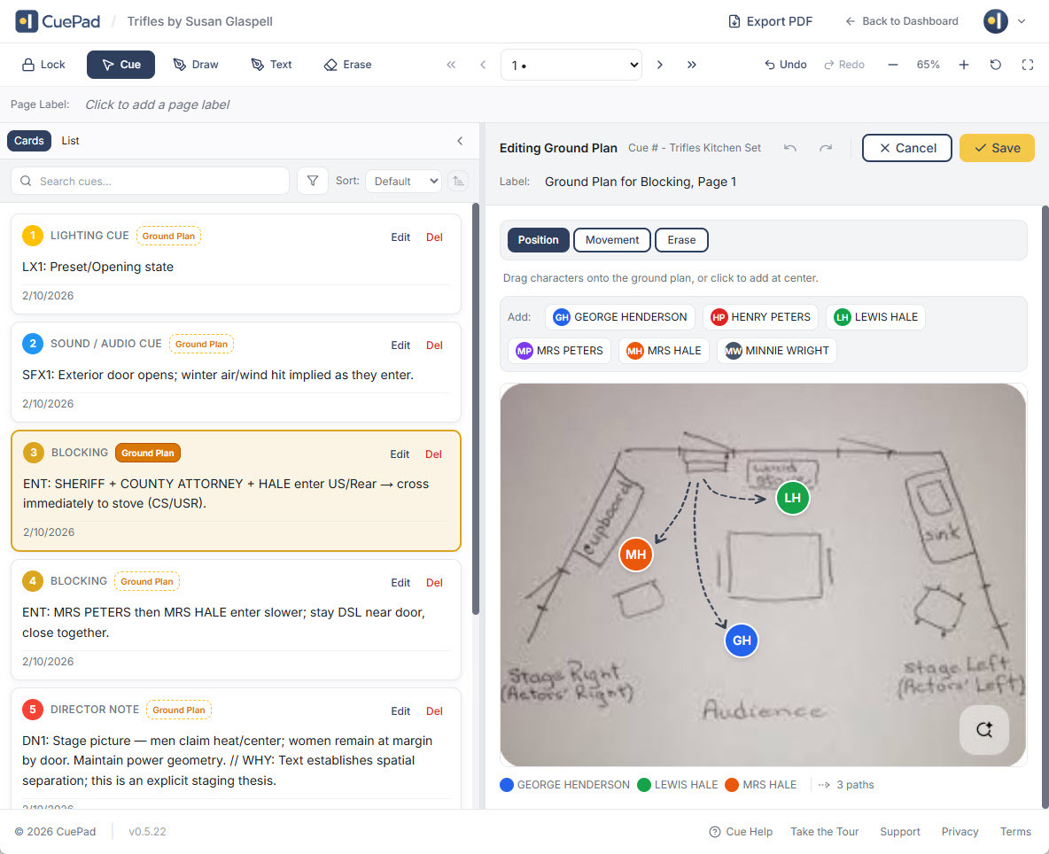 CuePad gives you interactive ground plans, character placement, movement paths, and script annotations — all in one system.