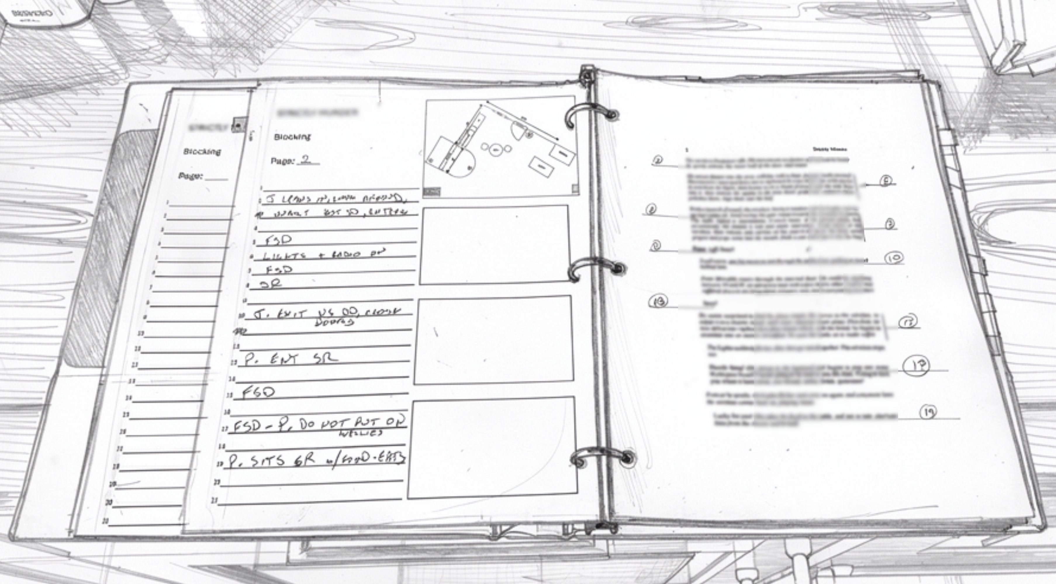Traditionally, blocking is recorded in a paper prompt book — a binder containing the script with wide margins for notes. The stage manager writes blocking shorthand next to the corresponding line, and may include small diagrams showing positions on a ground plan.